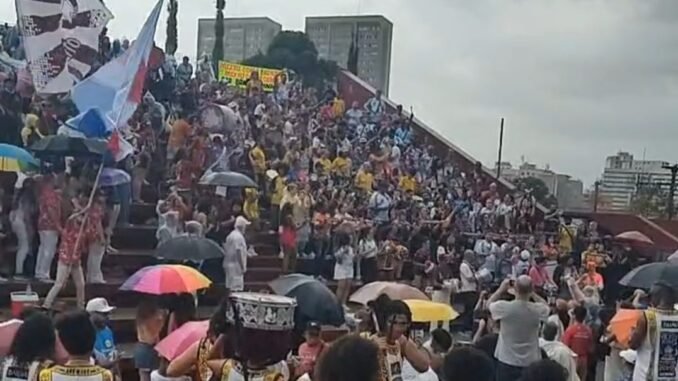 Mesmo sob tempo instável, escolas de samba, blocos e artistas lotam as Ruínas de São Francisco em ato contra projeto que pretende barrar recursos públicos para a festa mais popular do país