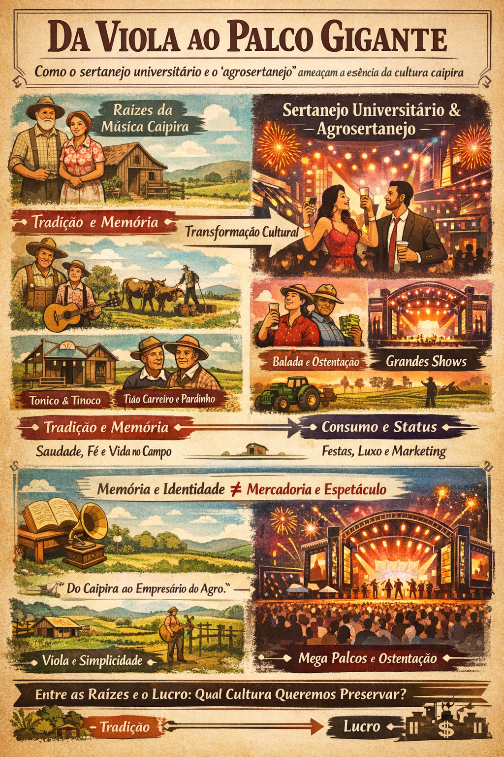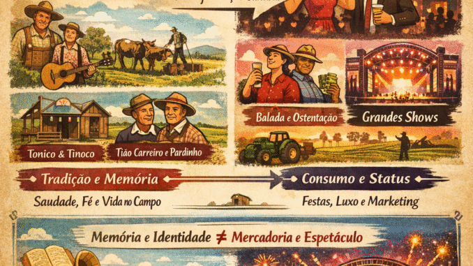 O perigo para a verdadeira cultura caipira não está apenas na mudança estética, pois a cultura é, por natureza, dinâmica. O risco reside na substituição da memória pela mercadoria. Quando o “agro” se torna marca e espetáculo, esvazia-se a complexidade da vida rural real, com suas contradições, sofrimentos e saberes tradicionais. O campo vira cenário; a identidade, produto; a tradição, estratégia de mercado.