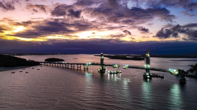 OBRA EMBLEMÁTICA – As obras da Ponte de Guaratuba alcançaram 85% de execução até o começo de dezembro. Com 1.240 metros de extensão e investimento superior a R$ 400 milhões, a estrutura tem previsão de conclusão em abril de 2026 e vai substituir definitivamente a travessia por ferry-boat, garantindo mais mobilidade, segurança e integração ao Litoral do Paraná.