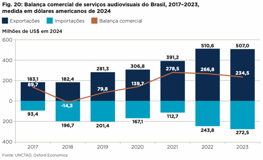 Além do mercado doméstico, o audiovisual brasileiro ampliou sua presença internacional. O Brasil registra superávit comercial em serviços audiovisuais desde 2017, com crescimento médio anual de 19% nas exportações. Em 2023, esse saldo positivo adicionou R$ 2,7 bilhões ao PIB — valor equivalente a mais de um terço do PIB gerado pelas exportações de aeronaves.