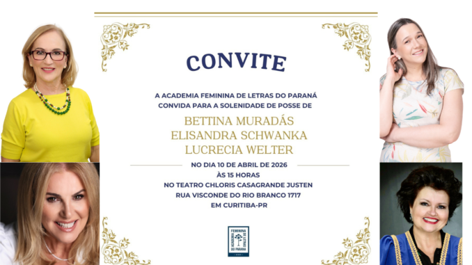 A Academia Feminina de Letras do Paraná realizará, na próxima sexta-feira, 10 de abril de 2026, uma sessão solene para a posse de três novas acadêmicas, que passam a ocupar cadeiras patronímicas da instituição. As empossadas são Bettina de Souza Pinto Muradás, Elisandra Cecília Schwanka de Oliveira e Lucrecia Welter Ribeiro.