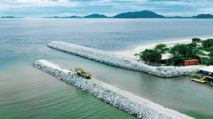 Equipamento marítimo localizado na desembocadura do Canal Artificial do Departamento Nacional de Obras e Saneamento (DNOS), no balneário de Pontal do Sul, tem previsão de término para dezembro. Estrutura trará uma série de benefícios para a região, incluindo contenção da erosão e melhorias no acesso turístico e de navegação. Investimento total é de R$ 9,9 milhões.